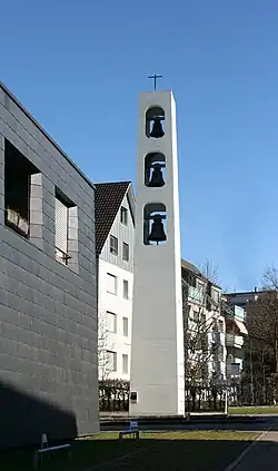 Der Kirchturm ist an der Chapfstrasse schon von weitem sichtbar. Die Glocken sind auf die Töne b, g und f gestimmt und mischen sich in ökumenischem Sinn in den Klang der reformierten Kirchenglocken. Sie wurden zwei Jahre nach dem Bau der Kirche im Mai bei der Giesserei Karl Czudnochowsky, Erdingen bei München, bestellt und im September 1961 nach Gossau überführt. Nach der Weihe der Glocken am 17. September, dem Eidgenössischen Bettag, durch den Bischof von Chur, Christian Caminada, wurden diese von der Gossauer Schuljugend in den Turm hochgezogen.[4][8]