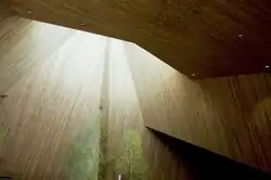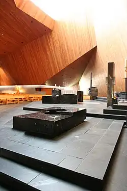 Der Architekt Justus Dahinden beschreibt den Innenraum mit folgenden Worten: «Wie Kulissen schieben sich die schrägen Decken und Wände in- und gegeneinander, lassen zum Altar hin den Raum an Höhe gewinnen und reflektieren das Licht auf vielfältige Weise, das von dem – den Blicken verborgenen – Fenster über der Mensa die Altarzonen aufhellt. Das rohe Holz gibt dem Raum Wärme und eine gewisse an einen Wohnraum erinnernde Behaglichkeit.»[18]