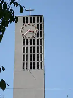 38 Meter hoch erhebt sich der 1935 zusammen mit der Kirche erbaute Turm.[10] Im Jahr 1941 erhielt der Turm seine Uhr, welche von der Turmuhrfabrik Mäder, Andelfingen, geschaffen wurde. Das Zifferblatt blieb bestehen, die Turmuhr dagegen wurde im Jahr 2000 durch eine digitale Uhr ersetzt. Gestützt auf ein Gutachten der Eidgenössische Materialprüfungs- und Forschungsanstalt erhielt der in Sichtbeton-Technik gestaltete Turm bei der Aussenrenovation von 1973 einen Verputz.[11]