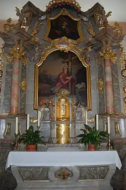 Der barock bewegte Hauptaltar aus Stuckmarmor mit farbigen Säulen, vergoldeten Kapitellen, gekröpftem Gesims und vergoldetem Zierrat aus Stuck enthält als Altargemälde ein Bild der büßenden Maria Magdalena in ihrer Einsiedelei. Er stammt aus einer deutschen Schule des 17. Jahrhunderts.[13] Putten mit silbernen und goldenen Girlanden flankieren eine weitere Kartusche oberhalb des Altarbildes, auf der Simon Petrus mit dem krähenden Hahn dargestellt ist. In der prunkvoll gerahmten Kartusche zwischen Altarbild und dem mit einer goldenen Krone ausgezeichneten Heiligenbild befindet sich die Inschrift ST. MAGDALENA ORA PRO NOBIS (lat.= Heilige Magdalena bitte für uns).