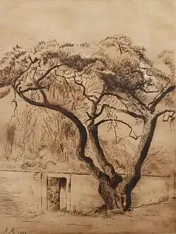 • Schepp-Allee in Darmstadt (verkrüppelte Kiefer vor Begrenzungsmauer), Radierung, 1911, Monogramm/Datierung unten links: „M M 1911“, ca. 26,5 × 20,5 cm[3]