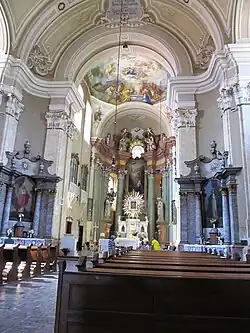 Die Wallfahrtskirche Maria-Radna ist eine einschiffige Wandpfeilerkirche mit eingezogenem, langgestrecktem Chor und trapezförmigen Apsiden. Die Länge der Kirche misst 56,2 Meter, die Breite des Schiffes 19,8 Meter, der Altarraum ist 9,3 Meter breit. Die Höhe der Kirche beträgt im Schiff 20,6 Meter. Aufgrund ihres besonderen Standortes, leicht erhöht am nördlichen Flussufer der Marosch gelegen und für den Besucher weithin sichtbar, wurde auf eine kanonische Ostung der Kirche verzichtet. Daher wurde der Chorraum im Westen, die Schauseite im Osten der Anlage errichtet. Der Chorraum ist mit einem Spiegelgewölbe, das Kirchenschiff mit einem Tonnengewölbe ausgestattet. Gurtbögen, die auf massiven Wandpfeilern ruhen, teilen das Langhaus in drei Joche. Die massiven Wandpfeiler besitzen einen quadratischen Grundriss und ragen weit in den Kirchenraum hinein. Sie werden auf drei Seiten mit duplizierten Pilastern geschmückt. Die Pilasterkapitelle wurden besonders aufwendig als korinthische Kapitelle mit reduziertem Laubwerk gestaltet. Über den Kämpfern befindet sich ein stark verkröpftes Gesims. Die zwischen den Wandpfeilern entstandenen Rundnischen dienen zur Aufnahme der Seitenaltäre. Neben dem Himmelfahrtsfresko ist das Gewölbe mit Architekturmalerei ausgestattet. Der Chor wird von je zwei Rundbogenfenstern und einem Ovalfenster in der Apsis beleuchtet. Die Beleuchtung des Langhauses erfolgt durch je drei tief in die Wand eingeschnittene Rundbogenfenster auf den Seitenwänden des Kirchenschiffes. Von der ursprünglich geplanten geschlossenen barocken Ausstattung des Innenraumes wurden nur wenige Stücke realisiert, dazu gehörten die Rahmung des Gnadenbildes, der Hochaltar, die Ampel für das ewige Licht sowie einige Altarblätter, die in den sechziger Jahren des 18. Jahrhunderts entstanden.[4]