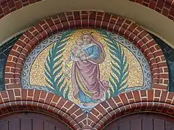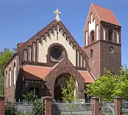 Das Kirchengebäude steht auf dem Grundstück Mühlenstraße 29, es entstand im Stil der Neoromanik unter der Leitung des Kreisbaumeisters Engelbrecht. Der Stil ist der ehemaligen Jerichower Klosterkirche nachempfunden, die sich auf dem Gebiet der Pfarrei befindet.[4] Der Kirchturm befindet sich nordöstlich des Kirchenschiffs. An der Nordseite des Schiffs entstand ein hoher Seitenanbau. An der Ostseite befindet sich in voller Breite des Kirchenschiffs ein mit einem Pultdach versehener Vorbau. In dessen Mitte befindet sich das risalitartig gestaltete Kirchenportal. Über dem Eingang ist als Mosaik zwischen Palmenblättern eine Mondsichelmadonna, ähnlich dem Genthiner Stadtwappen, abgebildet.