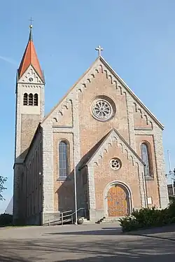 Die neuromanische Saalkirche wurde 1898–1899 nach Plänen des Architekten und königlich bayerischen Baubeamten Ferdinand Schildhauer in Backstein-Mauerwerk mit Gliederungen in Bossenwerk errichtet. Sie besteht aus einem Langhaus, einem eingezogenen Chor mit angebauter Apsis im Osten, einer Sakristei an der Südwand und einem Chorflankenturm auf quadratischem Grundriss an der Nordwand des Chors, der mit einem spitzen Helm bedeckt ist. In den Giebeln sind die Zifferblätter der Turmuhr angebracht. Sein oberstes Geschoss beherbergt hinter den als Triforien gestalteten Klangarkaden den Glockenstuhl.