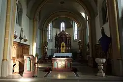 Der Innenraum des Langhauses ist mit einer Holzbalkendecke überspannt, der des Chors mit einem Stichkappengewölbe. Die Fresken an der Wand des Langhauses brachte Jakob Huwyler II. 1909–1911 an. Der Hochaltar wurde 1899, die Kanzel 1900 und die Seitenaltäre 1903–1904 aufgestellt. Die um 1760 entstandene Statue des Johannes Nepomuk wird Johann Michael Fischer zugeschrieben. Die Orgel mit 19 Registern auf zwei Manualen und Pedal wurde 1908 von der Werkstatt Gebrüder Hindelang in Ebenhofen erbaut.[1]