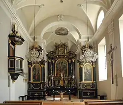 Die Inneneinrichtung ist größtenteils frühbarock. Die drei schwarz-gold gefassten Altäre und Bilder stammen von Michael Waldmann dem Jüngeren. Auf dem Tabernakel befindet sich das Gnadenbild, eine geschnitzte sitzende Madonna, die dem Jesuskind einen Apfel reicht. Es stammt aus der Zeit um 1420 und wurde im Barock überschnitzt. Die Passionstafeln an der Langhauswand stammen ebenfalls aus dem 15. Jahrhundert.