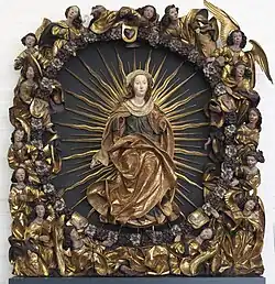 Die farbig gefasste Skulptur aus Lindenholz zeigt Maria über der Mondsichel, das dazugehörige Jesuskind und die Arme Marias gingen verloren. Den Kranz umgibt eine große Anzahl von Engeln, die vermutlich die Arma Christi trugen. Die skulptierte Rahmung aus dem Mittelschrein eines Rosenkranzretabels zeigt eine kreisförmige Reihung von stilisierten Blüten, die von Wappenschilden mit den Wundmalen Christi unterbrochen werden.