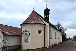 Die traufständige Saalkirche wurde 1706 erbaut. Sie besteht aus einem Langhaus, dessen westlicher Teil aus älterer Bausubstanz besteht, und einem eingezogenen, halbrund geschlossenen Chor im Osten. Aus dem Satteldach des Langhauses erhebt sich ein offener, mit einer Zwiebelhaube bedeckter Dachreiter, in dem eine Kirchenglocke hängt.