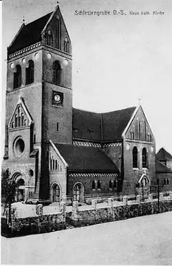Auf kreuzförmigem, dreischiffigem Grundriss entstand nach Entwurf von Max Giemsa (Kattowitz) eine neoromanische Backsteinbasilika mit einem 40 m hohen, rechteckigen Frontturm. Auch im Innern erhielt die Kirche eine neoromanische Ausstattung und Wandmalereien. Für die bedeutende Innenausstattung fertigte der Bildhauer Matthias Beule den Hauptaltar in Anlehnung an den Klosterneuburger Altar, die Taufkapelle, die Kanzel und das Triumphkreuz.[2] Die historischen Farbverglasungen wurden durch Bergschäden zerstört und bei der Renovierung durch moderne ersetzt.
