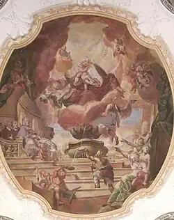 Das Tuchmachergewerbe kann nur bei entsprechendem Fließgewässer ausgeübt werden; dementsprechend ist auch das Wasser in der Kapelle thematisiert. Neben dem spätestens seit 1969 vollständig zugesetzten Quellverlauf im Langhausboden ist das zentrale Deckenfresko, das 1744 der Eichstätter Hofmaler Johann Michael Franz schuf, dem Wasser gewidmet: Es zeigt unter einem Mariahilf-Gnadenbild eine wasserspendende Muschelschale und eine Terrasse mit Kranken und Hilfssuchenden und gibt damit die typische Wallfahrtssituation einer Wasserkapelle wieder. Eventuell wird auch Bezug genommen auf das früher der Kapelle gegenüber liegende, von Euchar Schenk von Castell gestiftete Spital.[2] Die vier Eckmedaillons in grüner Grisaille greifen Themen des Hymnus „Ave maris stella“ auf.[8] Das bei der Umgestaltung von 1942 übermalte Chorfresko wurde 1993 wieder freigelegt; es ist nur in Fragmenten erhalten. Die Buntglasfenster des Chorraumes entstanden im 19. Jahrhundert.
