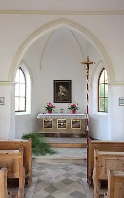 Der schlichte, neugotische Bau besitzt ein Langhaus zu zwei Achsen mit einer Spiegeldecke über von Profilen eingeschlossener Voute. Der gefasste, einspringende Chorbogen besitzt ein Kämpfergesims und einen spitzbogigen, profilgesäumten Schluss. Der nicht eingezogene Altarraum ist mit kurzen, hinter dem Chorbogen weitergeführten Seitenwänden und einem dreiseitigen Schluss mit Dreikappenwölbung mit Rippen auf Konsolen versehen. Die Fenster sind im Langhaus beiderseits zwei, in den Schrägachsen je eines in die Wände eingelassen und spitzbogig. Außen sind diese gefasst, innen mit profilierten Archivolten auf Konsolen versehen. Im Westen befindet sich eine Spitzbogentür mit Holzmaßwerk im Oberlicht. Beiderseits der Tür befinden sich runde Guckfenster. Vor dem Eingang ist ein Vorzeichen angebaut. Dieses besitzt gefaste Spitzbogenarkaden an drei Seiten und ein Satteldach. Das Traufgesims ist weit vorkragend und abgeschrägt. Im Westgiebel des Vorzeichens befindet sich auf einer weißen Marmortafel die Inschrift Erbaut ( von ) Ignatz u. Genovefa / Osterrieder / anno 1864.