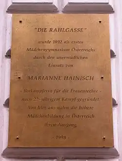 Erst 22 Jahre nach der von Marianne Hainisch formulierten Forderung wurde 1892 die erste private gymnasiale Mädchenschule im deutschsprachigen Raum vom Verein für erweiterte Frauenbildung ins Leben gerufen. Hainisch war Mitglied dieses 1888 gegründeten Vereins.[7] Die erste Mädchenklasse wurde in den Räumen des Gymnasiums in der Hegelgasse 12 eingerichtet. 1910 übersiedelte die Schule in das Gebäude Rahlgasse 4.