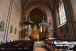 - Pfarrkirche Mariasdorf Mariae Himmelfahrt: Die spätgotische Pfarrkirche Mariae Himmelfahrt zählt zu den schönsten des Burgenlandes. Der Bau wurde, nachdem die Brüder Kanizsay das Herrschaftsgut Bernstein erhalten hatten[11], um 1400 am Standort einer bereits existierenden Kirche begonnen, aber wohl im frühen 15. Jahrhundert eingestellt. Bis dahin bestand wohl nur der Chorraum. Am Ende des Jahrhunderts wurden die Arbeiten mit dem Bau des Kirchenschiffs fortgesetzt. Das Westportal wurde 1490 vollendet. Das Sakramentshaus an der Nordwand trägt die Jahreszahl 1483. Auch Sakristei, Beinhaus und die beiden Treppentürme stammen wohl aus dieser Bauphase.[12] Im 17. und 18. Jahrhundert wurde die Kirche umgebaut, um sie an den damaligen Zeitgeschmack des Barock anzupassen. 1882–1899 wurden diese Umbauten unter der Leitung von Imre Steindl, des Architekten des Budapester Parlaments, weitgehend rückgängig gemacht und das Bauwerk wieder in gotischer Formensprache gestaltet. Zeugen dieses zweiten, neugotischen Umbaus sind der Hochaltar, die Kanzel, das Taufbecken und die Buntglasfenster.[12]