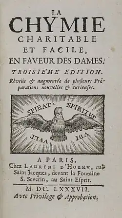 - ↑ Auflagen nach der Rezension der Neuauflage von Jean Flahaut, siehe Literatur, und Lucia Tosi: La Chymie Charitable et Facile, en Faveur des Dames de Marie Meurdrac, une chemiste du XVIIIe siecle. In: Compte Rendu Acad. Sci. Band 2 Ser. 2, Paris 1999, S. 531–534.
