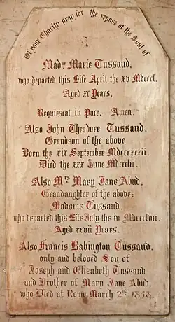 Marie Tussaud starb am 16. April 1850 mit 88 Jahren. Ihre letzte Ruhestätte befindet sich auf dem Friedhof der St. Mary’s Roman Catholic Church im Londoner Stadtteil Chelsea.[4]