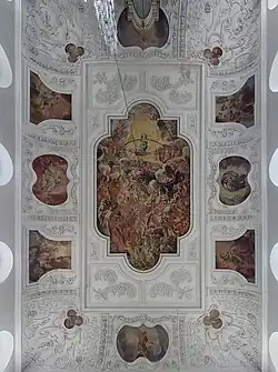 Das Kircheninnere wird von einer Spiegeldecke mit Stuckaturen überspannt, die dem Italiener Bernhardo Brentani zugeschrieben werden und 1718 fertiggestellt wurden. Ein mittig befindliches Fresko stellt das Jüngste Gericht dar. Drumherum gruppieren sich weitere Fresken, die die Seligkeiten, Christus, den Tod sowie Himmel und Hölle zeigen. Die Fresken wurden 1727 von Wilhelm Rössel vollendet.