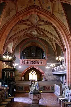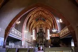 Das Kirchenschiff steht auf einem rechteckigen Grundriss und besitzt nur zwei Joche und ist breiter als lang. Der Chor ist wesentlich länger als das Langhaus. Beide sind von Netz- und Sterngewölbe überzogen. Der viergeschossige Westturm trägt über der Halle eine Empore mit steinerner Maßwerkbrüstung. Die Holzemporen mit Brüstungsgemälden im Schiff wurden 1642 eingebaut. Der zweigeschossige Altaraufsatz wurde 1670 mit reichen Schnitzereien eingebaut. Er stammt von einem Herrn Günther aus Ehrenhain. Der aus Rochlitzer Porphyr gefertigte Taufstein stammt aus dem 16. Jahrhundert. Eine Marienfigur besitzt die Kirche aus dem 15. Jahrhundert.[7] Während die Ausstattung der Kirche im Stil des Barock ausgefertigt sind, stammt die Kanzel aus der Zeit der Renaissance. In der Kirche befinden sich 45 großformatige Gemälde aus dem Jahre 1708.