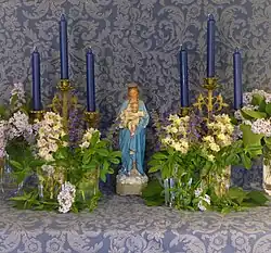 Eine Maiandacht kann in einer Kirche oder Kapelle an einem speziell dazu errichtetem Altar, einem vorhandenen Maialtar oder dem dafür umgestalteten Hauptaltar stattfinden. Dabei findet ein Bild oder eine Statue der Gottesmutter Maria Verwendung, hinzu kommt oft vielfältiger Blumenschmuck. Für das Straßburger Münster ist für das Jahr 1855 erstmals die Errichtung eines eigenen Maialtares vor dem Hochchor dokumentiert. Der priesterliche Segen wird häufig vor diesem Maialtar gespendet. Der Vorrang des Hochaltares sollte allerdings – so die kirchlichen Anordnungen – weiterhin sichtbar bleiben.[59][60][61][62][63] Wie die Maiandacht, so kam auch der Brauch der Maialtäre aus den romanischen Ländern Europas nach Deutschland. Französische Quellen vom Beginn der 1840er-Jahre berichten von der besonders prächtigen Schmückung der Marienaltäre in Kirchen und Kapellen und auch privater „Maialtärchen“ im Monat Mai.