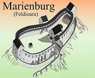 1838 wurde der Ort Marienburg (dessen rumänischer Name Feldioara lautet) mit der Ordensburg Marienburg durch ein Erdbeben stark zerstört. Der erhaltene Bestand wird heute unterschiedlich gedeutet. Die eher klassische Deutung geht offenbar davon aus, dass die Ur-Marienburg, also die östliche Befestigungsanlage, den eigentlichen Burgkomplex darstellt, den die Deutschordensbrüder errichteten. Eine andere Deutung geht davon aus, dass die westlich gelegene Befestigungsanlage die Reste der ursprünglichen Marienburg der Deutschordensbrüder darstellt und dass die östliche Befestigungsanlage nur den besser erhaltenen Vorwerkbereich beinhaltet.[1] Eine weitere Deutung geht davon aus, dass die Ur-Marienburg erst von den Siebenbürger Sachsen errichtet wurde.