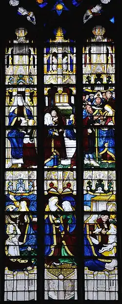 Das Fenster mit Szenen aus dem Leben Mariens wurde von König Ludwig XI. gestiftet. Oben von links nach rechts: Unterweisung Mariens, Präsentation im Tempel und Heirat mit Josef. Unten von links nach rechts: Verkündigung, Heimsuchung und Geburt Jesu.