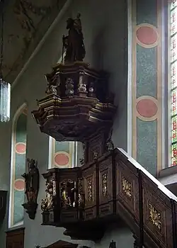 Die von Benedikt Lux geschaffene Kanzel ist an Korb und Schalldeckel mit Voluten versehen. Gegenüber der Kanzel befindet sich ein Dreifaltigkeitsaltar aus der Zeit um 1700 mit einer Darstellung der Hl. Dreifaltigkeit sowie der hl. Barbara.[31][30] Der Altar ist mit gedrehten Säulen und Schleiern aus schwerem Akanthus ausgestattet.[30]