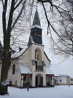 Die Kapelle ist eine Hallenkirche mit einem geschieferten Kirchturm mit drei Glocken über dem Eingang. In den Turm ist eine große Außenkanzel für Predigten integriert. Beidseitig neben dem Haupteingang sind zwei Nischen mit geschieferten Vordächern. An den Außenwänden stehen mehrere Statuen, eine Darstellung der Heiligsten Dreifaltigkeit sowie Jesus und Maria mit ihren Vorfahren. Darüber hinaus ist eine große Anzahl von meist aus Marmor bestehenden Votiv- und Danktafeln angebracht.