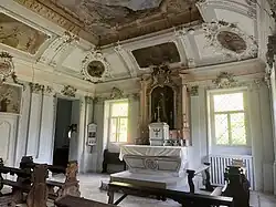 Der Kapellenraum ist mit dem Altar nach Nordosten ausgerichtet; der Eingang befindet sich auf der Südostseite. Die Wände sind zwischen den Fenstern, Türen und Bildflächen mit Pilastern gegliedert. Der Übergang zur Flachdecke ist als Voute gestaltet. Der Raum ist reich mit Rokoko-Stuckornamenten und Wandbildern geschmückt. Die Stuckaturen schufen die Brüder Bernhard und Johann Nepomuk Metz.[2] Die Altar-Ädikula enthält eine Marienstatue.