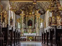 Zwischen den marmorierten Säulen stehen die überlebensgroßen Figuren des Heiligen Joachim und der heiligen Anna. Über dem Tabernakel liegt das von Strahlen umgebene Opferlamm auf dem Buch mit den sieben Siegeln.[6][13]