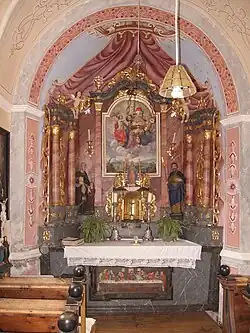 Der Altar besteht aus zwei Säulen auf niedrigen Sockeln, die ein verkröpftes Gebälk tragen mit einem in die Apsis gemalten Hintergrund. Der eingezogene Segmentbogenrahmen beinhaltet eine Darstellung der Krönung Marias. Die Seitenfiguren sind barock und stellen die Heiligen Anna, Maria und Joachim dar. Auf der Altarmensa befindet sich eine Darstellung des Heiligen Abendmahls. Der Tabernakel besitzt seitliche Akanthuslaubwangen.[2]