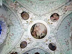 Von den sechs Fresken in der Marienkapelle stammen die fünf Deckenfresken von Johann Baptist Zimmermann, das Fresko an der Südwand von einem unbekannten Maler. Sie illustrieren Anrufungen aus der Lauretanischen Litanei und sind nach den Kupferstichen des Buches Elogia Mariana Ex Lytaniis Lauretanis Deprompta von Isaac Oxoviensis aus dem Jahre 1700 gestaltet.[4] Im Zentrum des Deckengewölbes der Marienkapelle befindet sich ein großes rundes Fresko, das von vier kleinen ovalen Fresken umgeben ist. Sie sind durch eingedrungene Feuchtigkeit beschädigt, bei drei kleinen Fresken sind nur noch spärliche Reste erkennbar. Da sich Zimmermann sehr stark an der Buchvorlage orientiert hat, kann man dennoch die abgebildeten Motive bei allen Fresken zweifelsfrei feststellen.