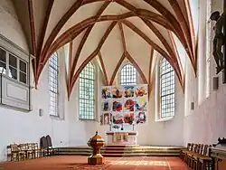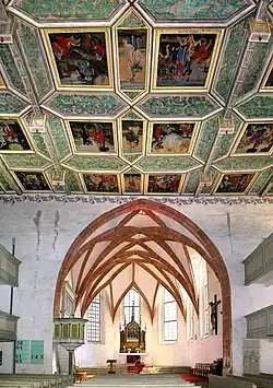 Im Innern überrascht die Breite des Raumes im Verhältnis zur Höhe, beachtenswert ist die Aufhängung der hölzernen Kassettendecke, die im Jahr 1720 prachtvoll von Johannes Roßberg aus Oschatz bemalt wurde. In den mit profilierten Leisten unterteilten Feldern sind mit Rankenwerksrahmung 56 szenische Darstellungen aus dem Neuen Testament, in den Mittelfeldern Johannes der Täufer, Paulus und die Evangelisten zu sehen. Der Chor ist mit Sterngewölbe und quadratischem Vorjoch gebildet, an seiner Nordseite ist die Sakristei mit einer Loge, in der Südvorhalle ein Sterngewölbe von 1522 eingebaut. An den Seiten ist der Raum mit zweigeschossigen Emporen eingefasst.