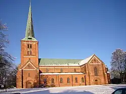 Nach der Ernennung der Kalkbergsiedlung 1156 zum Bischofssitz und der Rückkehr der Chorherren aus Högersdorf fand um 1156/57 die Grundsteinlegung einer riesigen dreischiffigen Kreuzbasilika mit angrenzenden Klosterbauten statt. Naturgegebene Holz-, Gips-, Ton- und Wasservorkommen ermöglichten den Bau in innovativer Ziegelbauweise im spätromanischen Stil. Eine 1192 von Kaiser Heinrich VI. ausgestellten Urkunde belegt erstmals das noch laufende Bauprojekt. 1199 wurde die Kirche in einer Urkunde von Papst Innozenz III. „eccl. S. Maria“ genannt, was auf eine inzwischen erfolgte Weihe hinweist. Nach rund 60 Jahren Bauzeit waren bis ca. 1216 alle für den Gottesdienst der Chorherren notwendigen Einrichtungen entstanden: Ein Querhaus mit zwei östlichen Nebenapsiden, ein östlicher Chor mit der Hauptapsis und drei Joche über dem westlichen Hauptschiff. Ornamentale Verzierungen der Kapitelle scheinen erst in verbautem Zustand aus großen Gipsblöcken herausgearbeitet worden sein und blieben teilweise unvollständig.