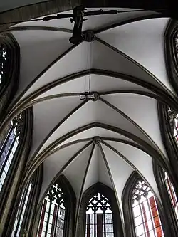 Hinter dem Triumphbogen folgt der um drei Stufen erhöhte, beinah die Höhe des Hauptschiffes erreichende gotische Chor. Zwei kurzen, sterngewölbten Rechteckjochen folgt ein polygonaler 5/8-Schluss. Das Maßwerk der dreibahnigen Fenster des Chores ist gekennzeichnet durch Kleeblattbögen, darüber Dreiblätter und Vierpässe. Den Abschluss im Spitzbogen der Fenster bildet je eine kreuzförmige Anordnung von vier verbundenen Vierpässen.