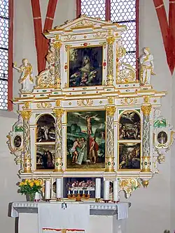 Der Altar aus der ersten Hälfte des 17. Jahrhunderts hat einen dreiteiligen Aufbau mit korinthischer Säulenordnung, geschnitzten, zum Teil figürlichem Wangenschmuck und allegorischen Aufsatzfiguren. Das Hauptbild trägt eine Darstellung von Sünde, Tod und Erlösung im Sinne der späten Cranach-Altäre, jedoch ohne stilistischen Zusammenhang.
