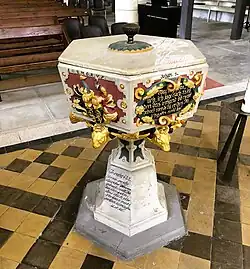 Der Taufstein der Marienkirche ist eine Arbeit des 17. Jahrhunderts. Der Zeitpunkt seiner Erbauung lässt sich insofern eingrenzen, als dass er vom Eilenburger Amtshauptmann Philipp Ernst Graf von Mansfeld und seiner Frau Elisabeth von Mansfeld, geb. von Reuß, gestiftet worden ist. Von Mansfeld bekleidete das Amt von 1602 bis 1631. Das Taufbecken ist sechsseitig. Die Seitenflächen schmücken abwechselnd kartuschengerahmte ovale Inschriftfelder mit Bibelversen und die Familienwappen der Stifter, nämlich das derer von Mansfeld und das derer von Reuß. Über den Wappen befinden sich die Initialen der Stifter. Dabei steht „P . E . G . U . H . Z . M . E . H . Z . H .“ für Philipp Ernst Graf Und Herr Zu Mansfeld Edler Herr Zu Heldrungen und „E . G . Z . M . G . R . V . P .“ für Elisabeth Gräfin Zu Mansfeld Geborene Reußin Von Plauen. Plastisch gestaltete Widderköpfe tragen das Becken und stellen den Übergang zum Standfuß dar. Der originale Fuß ist im Laufe der Zeit gegen einen neuen ausgetauscht worden.[17] Der Taufstein befindet sich im Chor am Übergang zum Langhaus mittig unter dem spitzbogigen Triumphbogen.