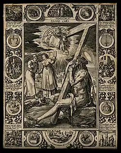 PASSIO CHRISTI (Leiden Christi) lautet die Überschrift der oberen Gemäldeformation auf der rechten Seite. Christus sitzt als Schmerzensmann auf einem Stein und umklammert mit beiden Händen sein Kreuz. Eine Frau mit den Gebotstafeln, die den Gehorsam gegenüber Gott verkörpert, führt einen gläubigen Mann an der Hand zu Christus. Während der Gläubige auf den am Boden liegenden Amor-Knaben tritt und so die irdische Liebe überwindet, erscheint am Himmel eine Frau mit Kindern, die die Liebe zu Gott symbolisiert.