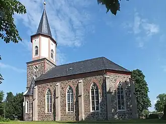 Die Kirche ist ein Bruchsteinbau mit polygonal geschlossenem Chor und hat Spitzbogenfenster mit Maßwerk. Der Kirchturm an der Westseite ist mit einem oktogonalen Glockengeschoss und Treppentürmen ausgestattet. Zum Bauwerk gehört eine Sakristei.