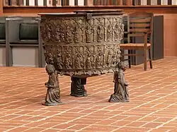 Von der mittelalterlichen Kirchenausstattung sind zahlreiche Inventarstücke erhalten: Das bronzene Taufbecken wurde 1337 von Hans Apengeter gegossen. Es stand bis 1942 im Westen der Kirche, danach befand es sich in der Mitte des Chorraums. Im Zusammenhang mit umfassenden Sanierungsarbeiten 2023, bei denen auch das Altarretabel zurückversetzt wurde, wurde das Taufbecken wieder im Westen der Kirche aufgestellt.[21] Sein Inhalt von 406 Litern entspricht dem Hamburger bzw. Bremer Bierfass (405 Liter).[22]