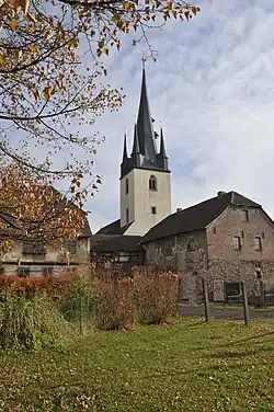 Der Turm ist in seinem Ursprung gotisch, wird von seitlichen Anbauten flankiert und ist in den Kirchenbau einbezogen. 1785 erfolgte der Aufsatz des Glockengeschosses in gotischem Stil mit Spitzhelm und vier Ecktürmchen.[1]