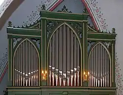 Auf der 1787 eingebauten Westempore erklingt seit 1873 die Orgel der Werkstatt Marcussen, Apenrade, hinter einem neugotischen Prospekt. Das Instrument hat 7 Manualregister und ein Pedalregister. Die originalen Prinzipalpfeifen im Prospekt mussten im Ersten Weltkrieg abgegeben werden, sie wurden durch Blechpfeifen ersetzt. Seit 1991 erklingt das Register wieder mit Pfeifen aus Zinn.[4]