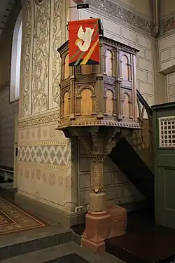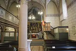 Im Norden und Westen wurde 1608 eine hölzerne Winkelempore eingebaut, die auf Pfosten mit runden Bügen ruht. Die querrechteckigen Füllungen der Brüstung zeigen abwechselnd grüne Rankenornamente auf braunem Hintergrund und polychrome Bilder der zwölf Apostel aus dem 17. Jahrhundert.[1] In der Südostecke des Schiffs ist ein hölzerner, olivgrüner Pfarrstuhl eingebaut, der in der oberen Hälfte durchbrochenes, weiß bemaltes Gitterwerk hat. Er gewährt den Aufgang zur holzsichtigen Renaissance-Kanzel von 1568. Die Kanzelfelder haben in zwei Zonen Rundbögen mit auskragenden Kämpfern. In der gegenüberliegenden Nordost-Ecke der Kirche ist eine weitere, bauähnliche Sakristei mit Gitterwerk errichtet. Das schlichte Kirchengestühl lässt einen Mittelgang frei. Eine Wendeltreppe in der Nordwestecke führt in den Dachraum.[15]