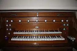 Eine erste Orgel wurde 1752 von Orgelbauer Dreuth aus Griedel eingebaut. Nach zwei Blitzschlägen in den Jahren 1892 und 1893 hatte das Instrument Schaden gelitten und wurde 1895 von Gustav Raßmann ersetzt. Der Orgelneubau hatte einen neugotischen Prospekt und verfügte über 15 Register auf zwei Manualen und Pedal. Das Instrument wurde 1954/1955 von G. F. Steinmeyer und Günter Hardt umgebaut und klanglich umdisponiert. Sie erhielt einen Freipfeifenprospekt und einen neuen Unterbau. Das Pfeifenwerk von Raßmann mit 15 Registern und mechanischen Kegelladen wurde weitgehend beibehalten. Die Disposition lautet wie folgt:[18]