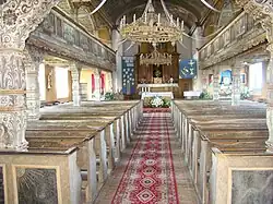 Der Innenraum ist dreischiffig angelegt, in der Mitte gewölbt und über den Seitenemporen flach gedeckt. Die Ständer und Balken sowie Holzflächen sind von dem Königsberger Künstler Günther mit Ornamenten, stilisiertem Rankenwerk, Blättern und Blüten in den masurischen Farben blau, weiß und rötlich reichhaltig ausgemalt worden.[1] Dabei soll auch ein Tierbild verewigt worden sein: Jacob, das Transportpferd – mit dem Text Ich, Jacob, karrte den größten Teil der Steine zum Bau dieser Kirche heran.[1]