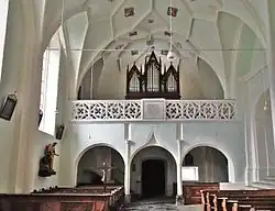 Im vierjochigen, einschiffigen Langhaus ruht ein Sternrippengewölbe auf gekehlten Wandpfeilern mit Runddiensten. Die Wappenschlusssteine, die 31 Halbfiguren in Vierpässen sowie die vier Evangelistensymbole im östlichen Joch entstanden im ersten Viertel des 16. Jahrhunderts. Die Orgelempore im Westjoch steht auf einer Pfeilerarkatur aus zwei Rundbögen und einem mittleren Kielbogen. Unterwölbt wird die Empore von Schlingrippen, deren frei endenden, nasenförmige Fortsätze den Rippen den Charakter von Astwerk geben. Die Arkadenpfeiler sind mit Runddiensten besetzt, deren Kapitelle die Basen von Figurennischen bilden. Die Emporenbrüstung besteht aus durchbrochenem, Flamboyant-Maßwerk. Ein spitzbogiger, profilierter Triumphbogen verbindet das Langhaus und den niedrigeren, zweijochigen Chor. Im Altarraum erhebt sich ein Netzrippengewölbe über zusammengesetzten, polygonalen Wandvorlagen, die vom Fenstersohlbankgesims aufsteigen. Die Schlusssteine stellen das Haupt Christi, das Lamm Gottes sowie Wappen dar. Die 14 halbfigurige Darstellungen von Heiligen in den Rautenfeldern stammen aus dem letzten Viertel des 15. Jahrhunderts. Das Wandgemälde an der Chornordwand vom Anfang des 16. Jahrhunderts stellt den Stammbaum Christi in der Art der Wurzel Jesse dar. An der Chornordwand befindet sich die spätgotische, abgefaste Zugangsöffnung zum Turm und darüber eine spitzbogige Emporenöffnung mit geschnitzter Brüstung. Von der Chorsüdwand führt ein Rundbogenportal in die Sakristei. Im südlichen Chorfenster wurden Glasmalereien aus der Mitte des 14. Jahrhunderts mit Darstellungen der Madonna und der Anna selbdritt eingebaut.