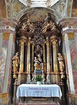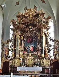 Der barocke Hochaltar mit Opfergangsportalen von 1753 besitzt eine raumgreifende stark plastische Säulenarchitektur mit vorschwingenden Gebälkteilen. Das Altarblatt zeigt Maria als Himmelskönigin, verehrt von den Ständen. Seitlich stehen die Statuen der heiligen Georg, Rosalia, Anna, Joachim, Barbara und Florian. Das Aufsatzbild mit der Heiligen Familie wird von den Figuren der Heiligen Zacharias und Elisabet flankiert. An den Chorwänden sind die Konsolfiguren der vier Evangelisten aufgestellt. Unter der Chorempore hängt ein Gemälde des Jüngsten Gerichts aus der zweiten Hälfte des 18. Jahrhunderts. Die beiden Seitenaltäre, die Kanzel und die Betstühle entstanden in der Mitte des 18. Jahrhunderts. Die Wangen der Betbänke sind mit floraler Schnitzerei verziert. Das Altarblatt des linken Altars zeigt eine nach Rembrandt gemalte Kreuzabnahme, seitlich stehen die Skulpturen zweier heiliger Ordensfrauen. Am Bild des rechten Seitenaltars ist die Muttergottes mit Kind und dem heiligen Antonius von Padua zu sehen, flankiert von den Statuen der Heiligen Aloisius und Johannes Nepomuk. An der südlichen Langhauswand ist eines Schnitzgruppe des einen Eingeborenen taufenden Franz Xavers aus der Mitte des 18. Jahrhunderts aufgestellt.