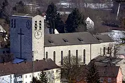 Über den Seiteneingängen zur Kirche befinden sich zwei Reliefs, die die Geburt Christi und Mariä Verkündigung darstellen. Die steile Ostwand über dem Altar schmückt eine Kreuzigungsgruppe in Sgraffitoplastik, die von Prof. Gruber aus München gestaltet wurde.[3]