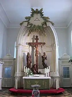- Kreuzigungsgruppe, als Tiroler Holzschnitzerei aus Lärchenholz von Ferdinand Demetz aus St. Ulrich in Gröden. Darauf dargestellt sind neben dem gekreuzigten Christus, seine stehende Mutter Maria und der Apostel Johannes. Am Kreuzstamm kniet betend Maria Magdalena mit dem Salbgefäß.