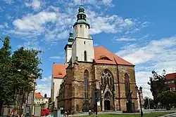 Die Kirche wurde ursprünglich 1211 von Heinrich dem Bärtigen gestiftet und im romanischen Stil von den Bürgern erbaut, die im selben Jahr das Stadtrecht erhielten. Um 1300 wurde die Kirche von den Johannitern im gotischen Stil ausgebaut, die die Kirche Ende des 13. Jahrhunderts übernommen hatten. Der Innenraum wurde im 17. Jahrhundert barockisiert. Ebenso wurden die Türme im Barockstil hinzugefügt. Die Kirche wird derzeit als Pfarrkirche genutzt.
