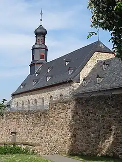 Die Klosterkirche ist über den Grundmauern und im Westen über dem gewölbten Raum des tiefer liegenden gotischen Vorgängerbaus aus der ersten Hälfte des 14. Jahrhunderts errichtet.[13] Das langgestreckte Schiff wird an beiden Langseiten durch je sieben hohe rundbogige Fenster mit Wabenverglasung belichtet, deren profilierte Gewände aus rotem Sandstein einen Schlussstein haben. Im Inneren sind die tiefen Laibungen nach unten abgeschrägt. Nur das mittlere Fenster in der Südseite endet in halber Höhe, da hier das Südportal die Kirche erschließt. Eine Glasmalerei auf dem zweiten Südfenster zeigt den hl. Wendelin auf einer Kabinettscheibe, die möglicherweise aus der Vorgängerkirche übernommen wurde. Das vollständig verschieferte Schopfwalmdach ist in zwei Ebenen mit kleinen Gauben bestückt. Im Westen ist ein verschieferter Dachreiter aufgesetzt, dessen viereckiger Schaft in eine oktogonale Glockenstube übergeht, die an vier Seiten rundbogige Schalllöcher hat. Der Dachreiter beherbergt eine Rincker-Glocke.[14] Ein geschwungenes Dach vermittelt zur oktogonalen Laterne mit acht rundbogigen Schalllöchern, dem ein Zwiebelhelm aufgesetzt ist. Dieser wird von einem Turmknauf, schmiedeeisernen Kreuz und vergoldeten Wetterhahn bekrönt.