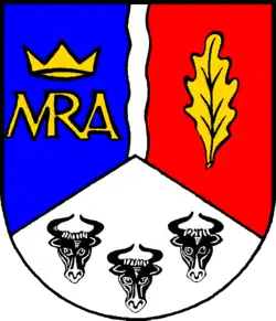 Beschreibung: Durch Göpelschnitt geteilt, oben durch eine silberne Wellenpfahlleiste gespalten von Blau und Rot; In Feld 1 ein goldenes Buchstabenemblem, gebildet aus den miteinander verbundenen Antiqua-Versalien M R A (Maria), darüber schwebend eine goldene dreizackige Krone; in Feld 2 ein goldenes stehendes Eichblatt; in Feld 3 in Silber drei zwei zu eins gestellte schwarze Stierköpfe.